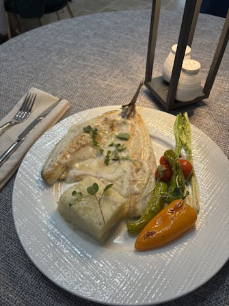 Pan seared Bronzini with white wine reduction and potato gratin Citrus marinaded pork tenderloin skewers