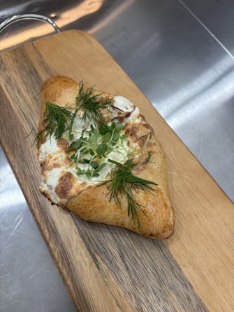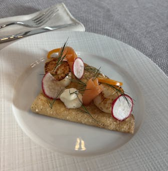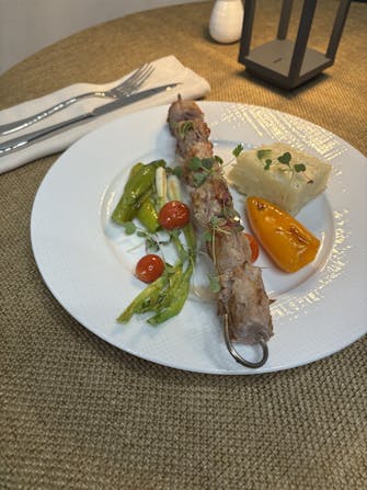 Beef Skewer from Demkota Tenderloin Crepe Richelieu with scallops and smoked salmon